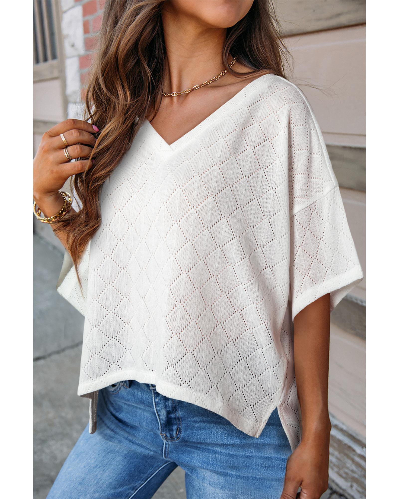 White V Neck Knitted Flowy Blouse – S