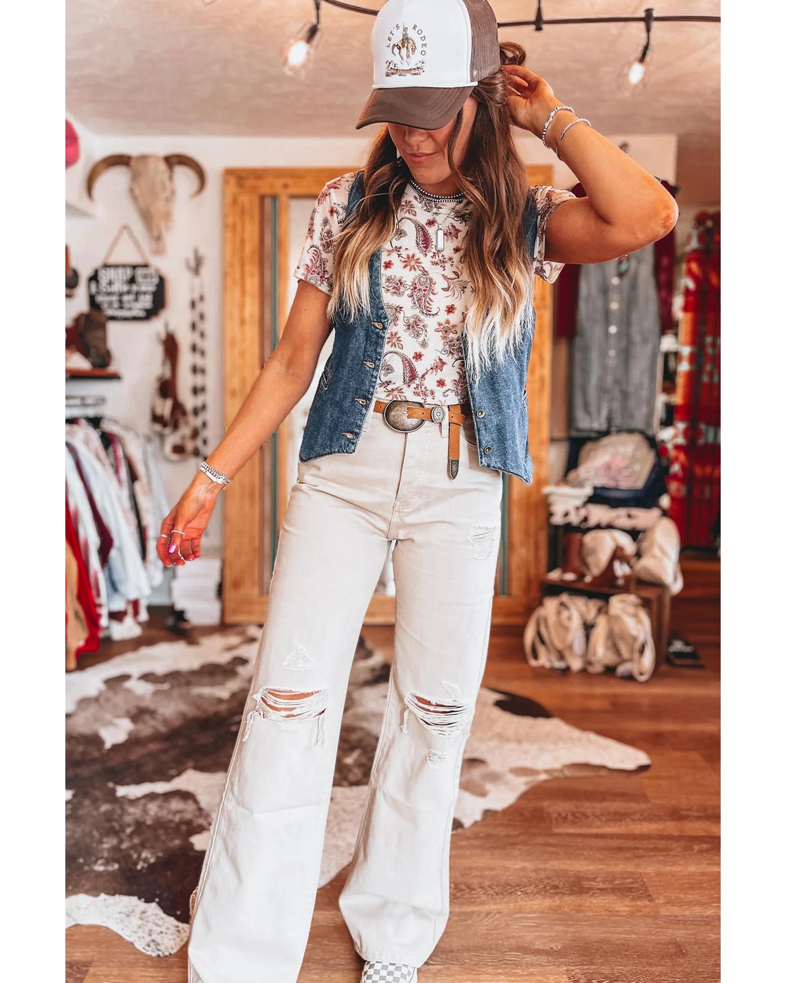 White Vintage Paisley Mock Neck T Shirt – L