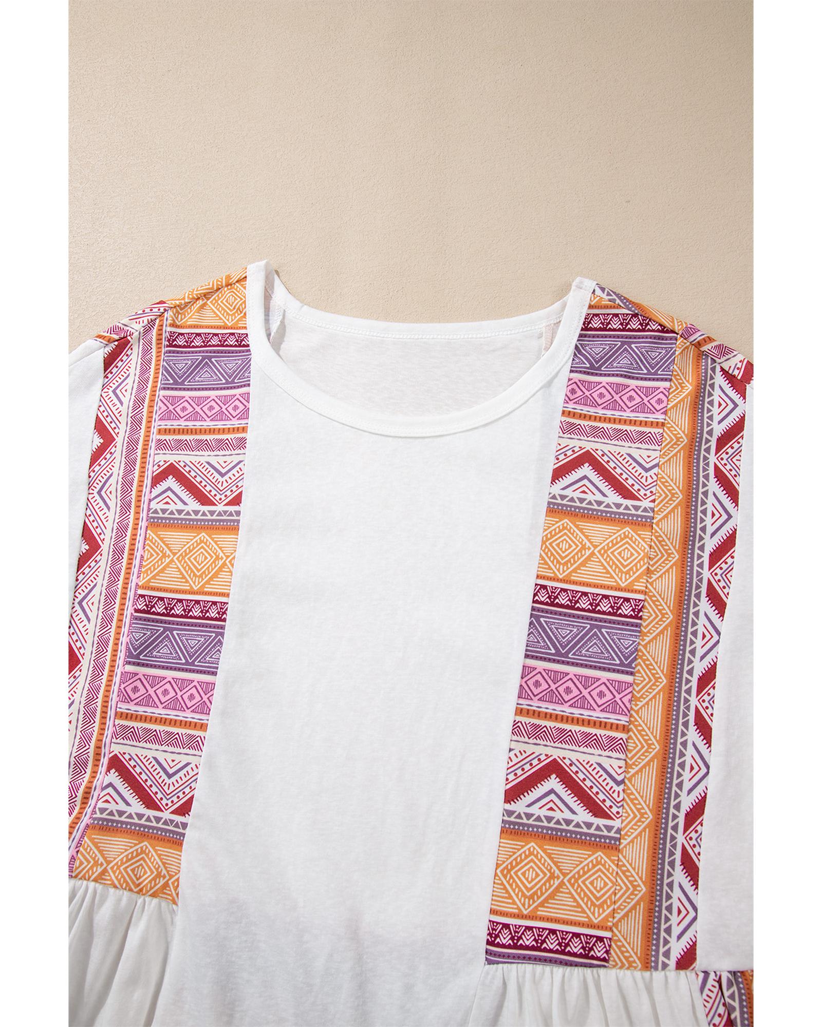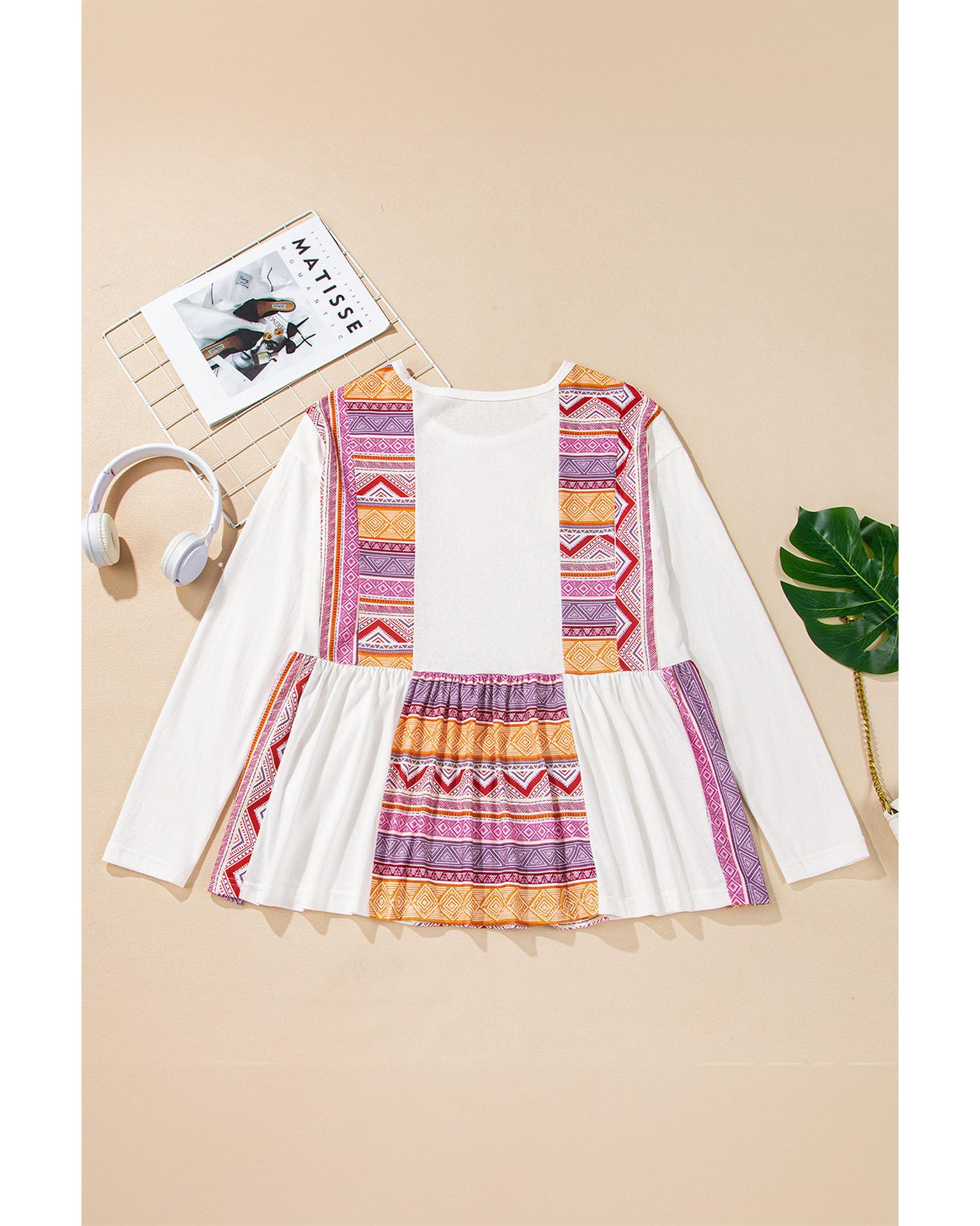 White Western Aztec Print Patchwork Ruffled Tunic Long Sleeve Babydoll Top – L