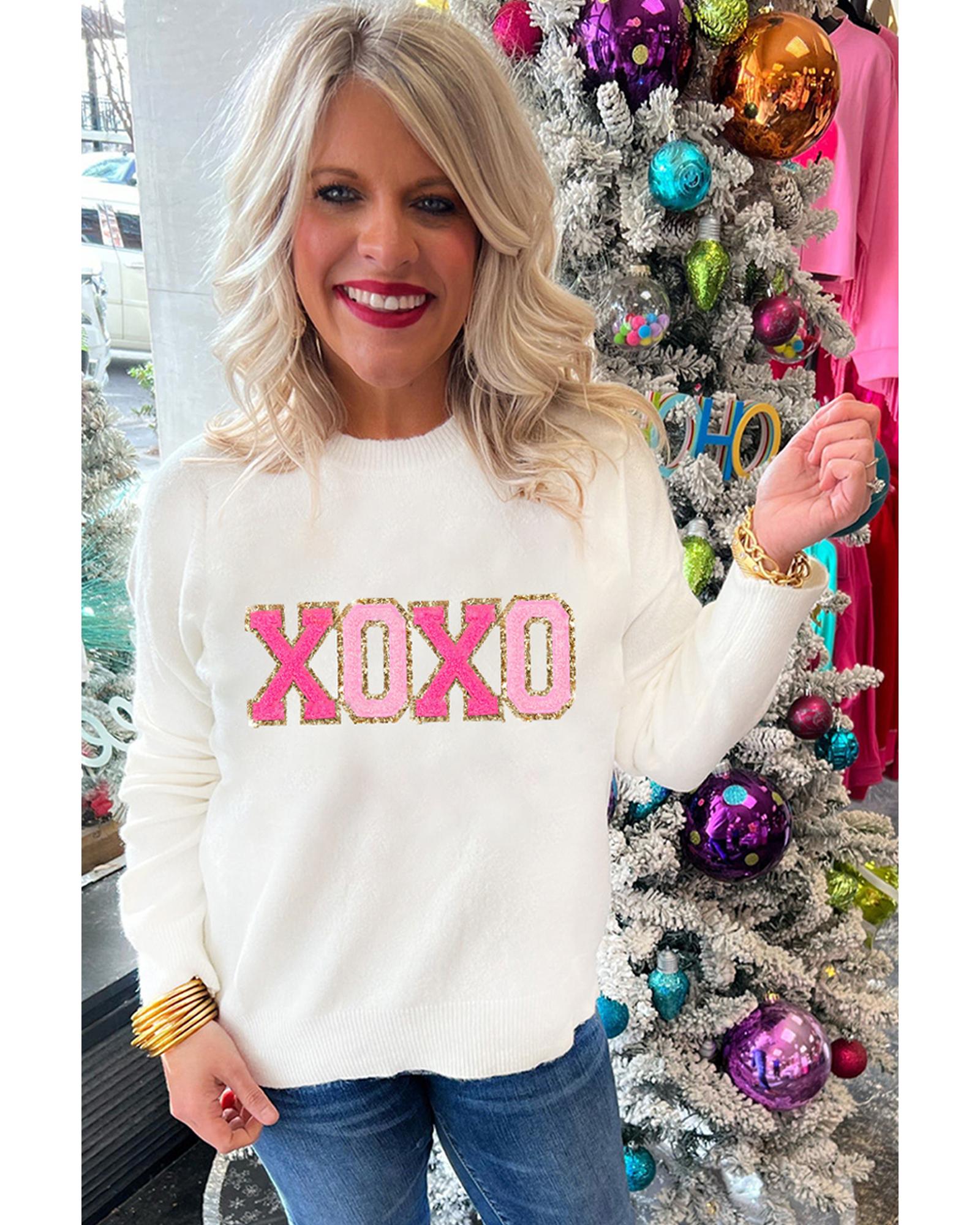 - White XOXO Glitter Print Round Neck Casual Sweater