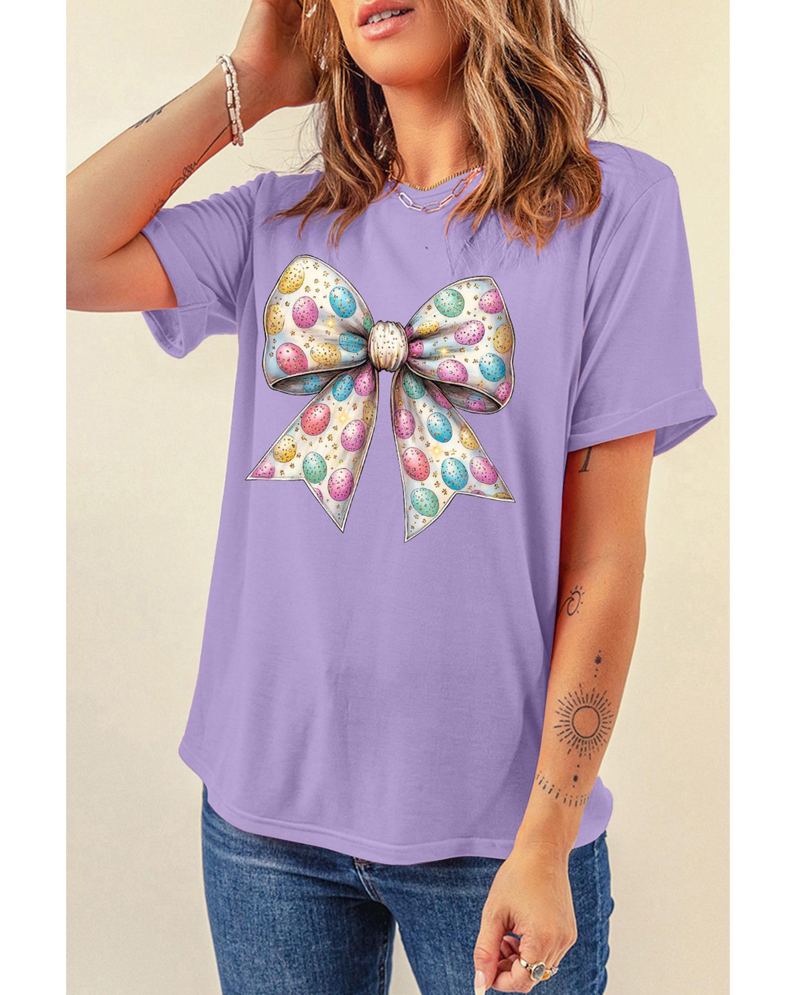 Wisteria Celebrative Easter Eggs Bow Print Casual T Shirt – S