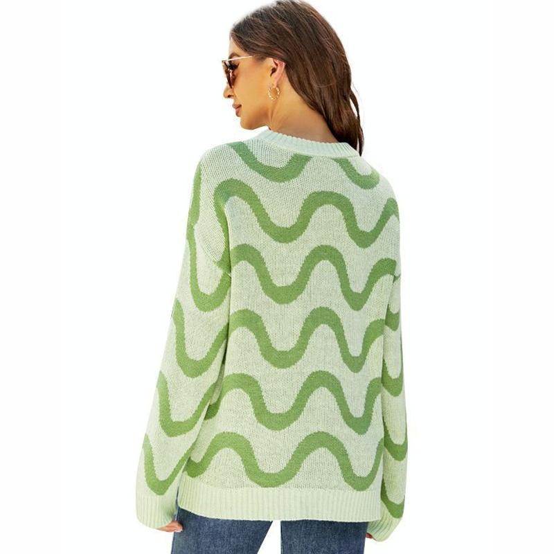 Women Casual Pullover Sweater Round Neck Wave Pattern Collision Colour Knitted Sweater – Size L Black – Black