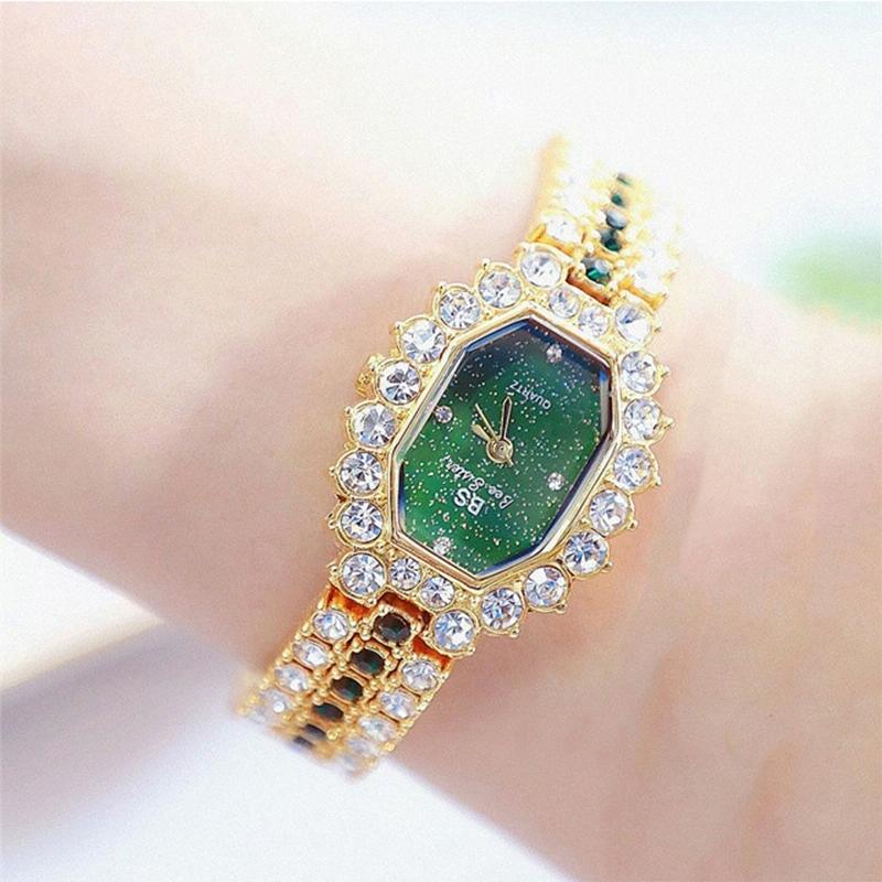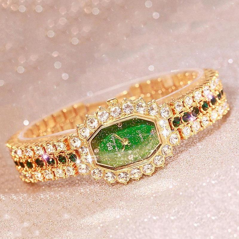 Women Diamond Plated Octagonal Quartz Watch with Rhinestone Bracelet – Gold Shell Green Diamond