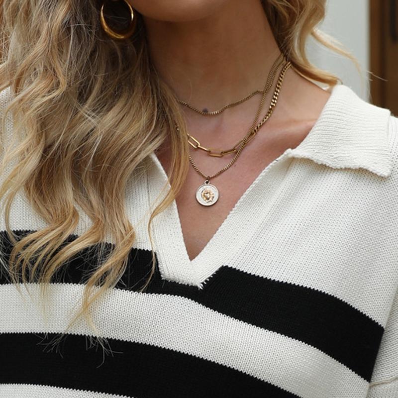 Women Lapel Cotton Knit Top Loose Stripes Hit Colour Pullover Sweater – Black And White – M