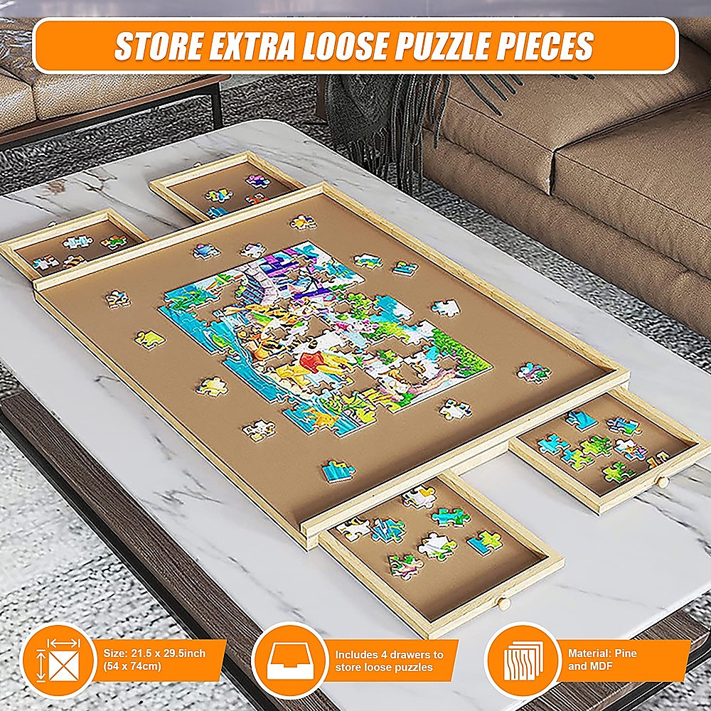 - Includes 4 drawers to store extra loose puzzle pieces