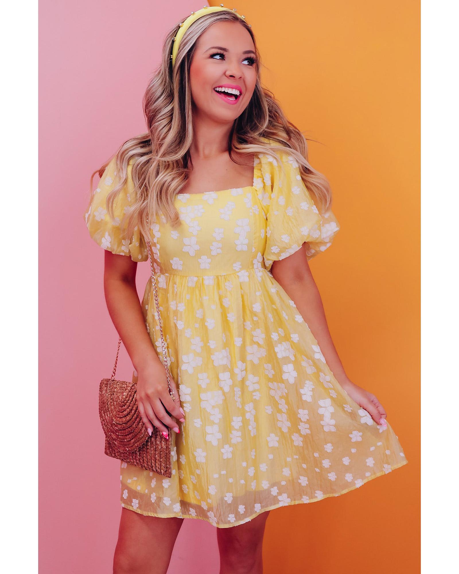 Yellow Boho Flower Jacquard Puff Sleeve Square Neck Mini Dress – XL