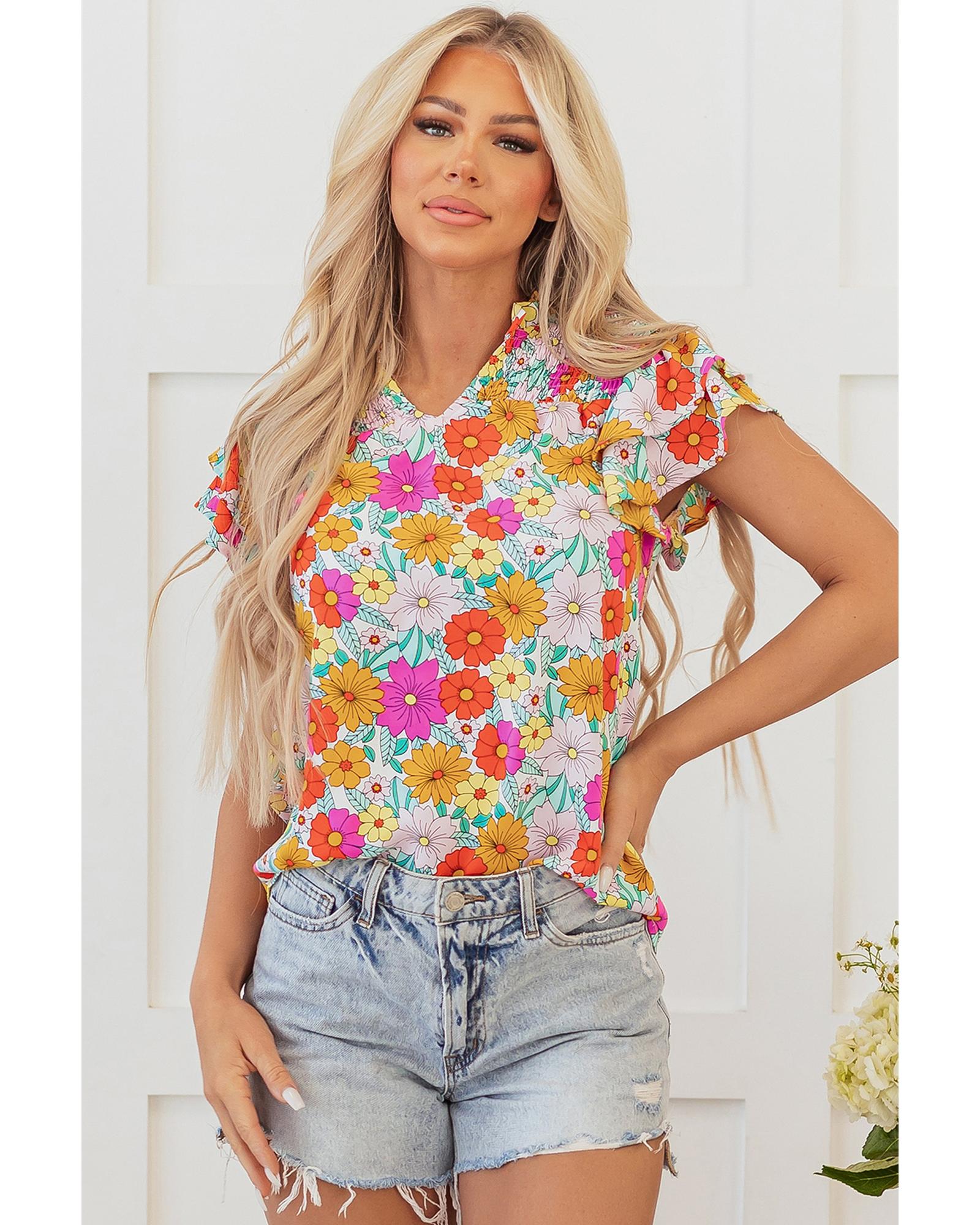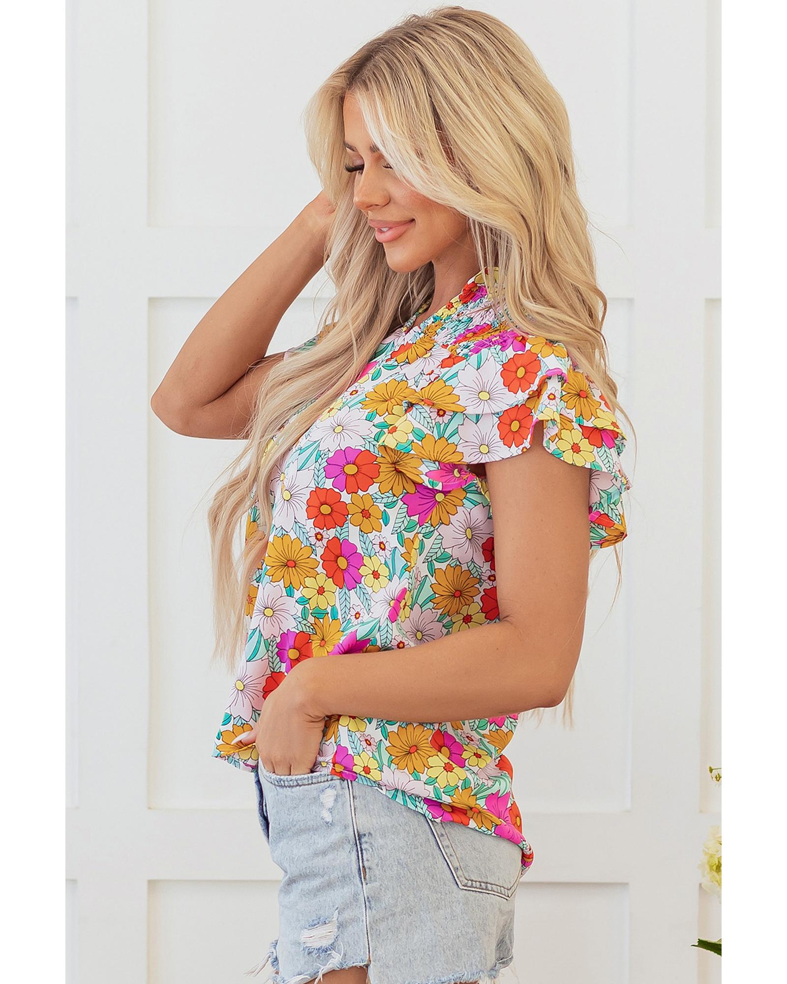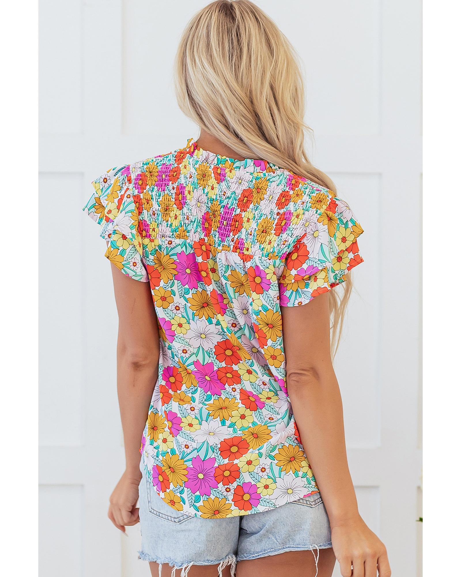 Yellow Floral Print Shirred Tiered Ruffled Sleeve Blouse – L