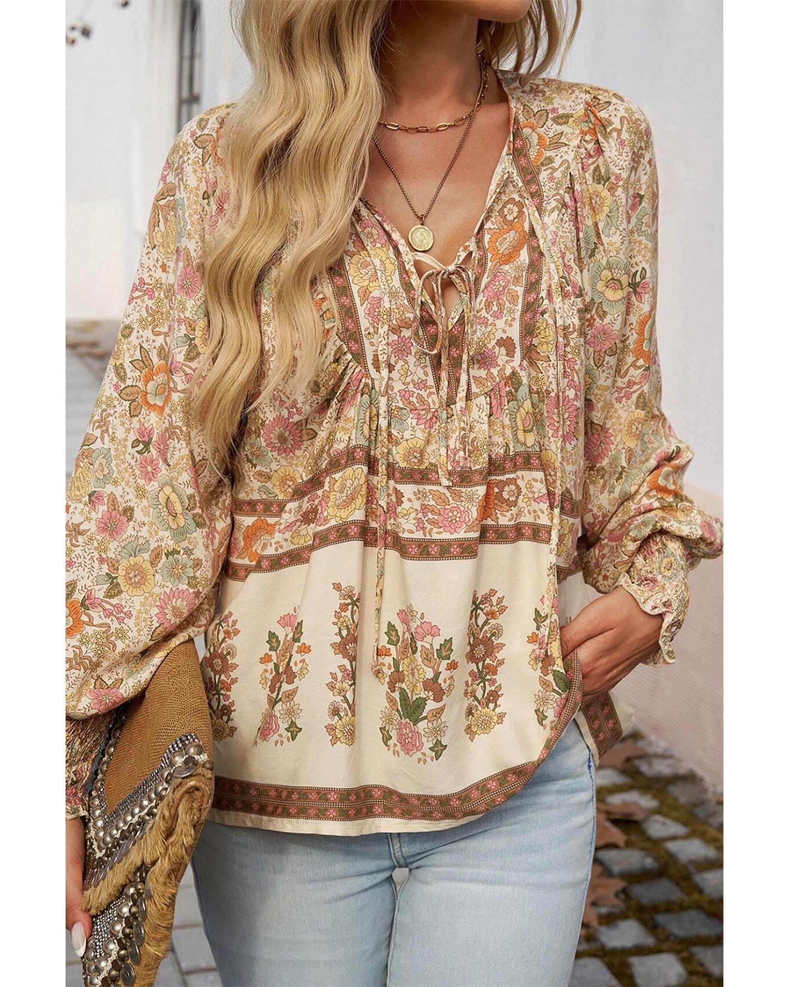 - Yellow floral print tie neck lantern sleeve blouse