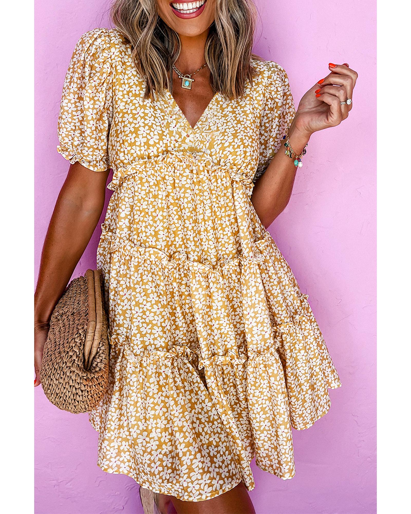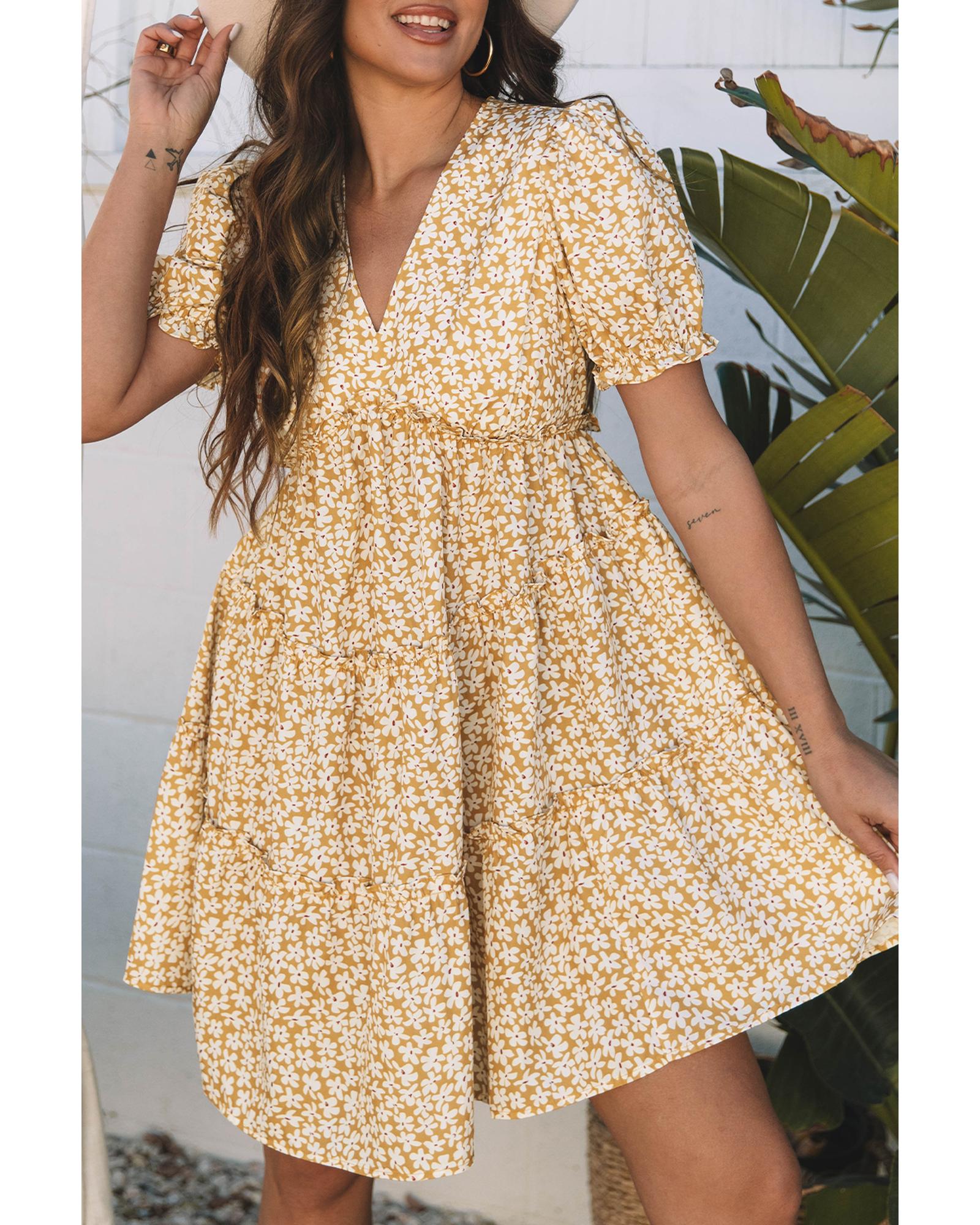 Yellow Floral Short Sleeve V Neck Frilly Tiered Mini Dress – L