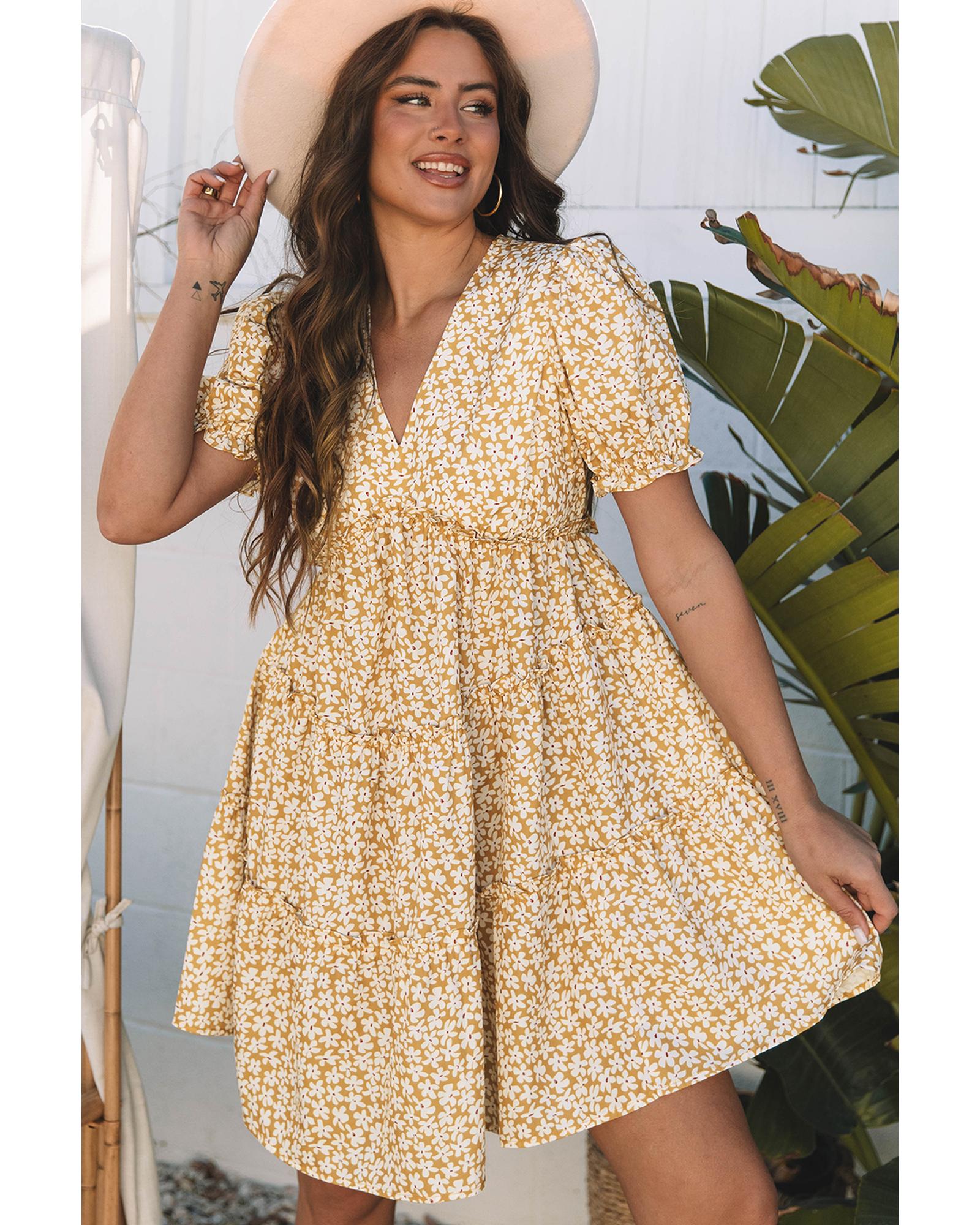 Yellow Floral Short Sleeve V Neck Frilly Tiered Mini Dress – S