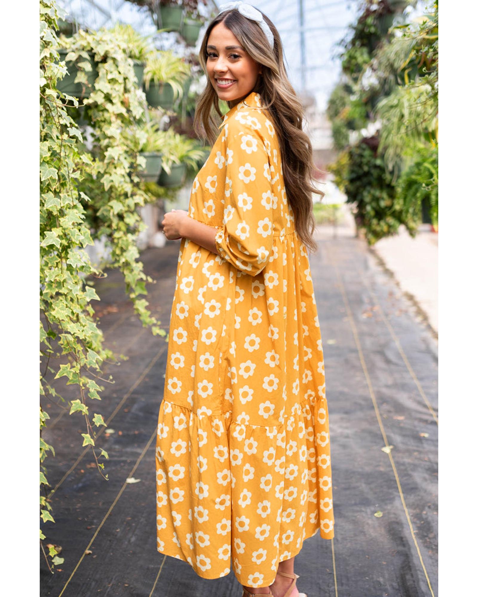 Yellow Flower Print Bracelet Sleeve Buttons Collared Maxi Dress – L
