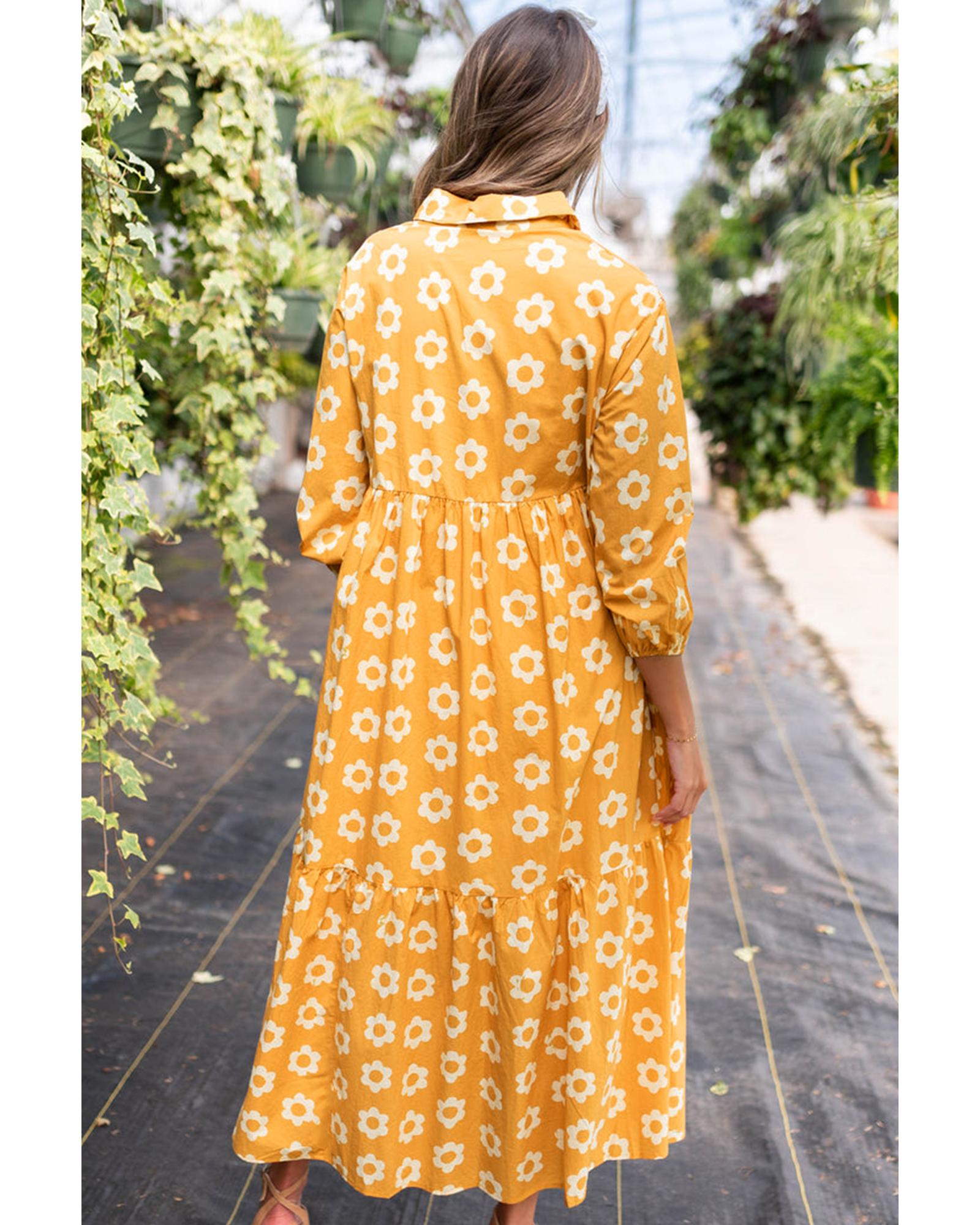 Yellow Flower Print Bracelet Sleeve Buttons Collared Maxi Dress – M