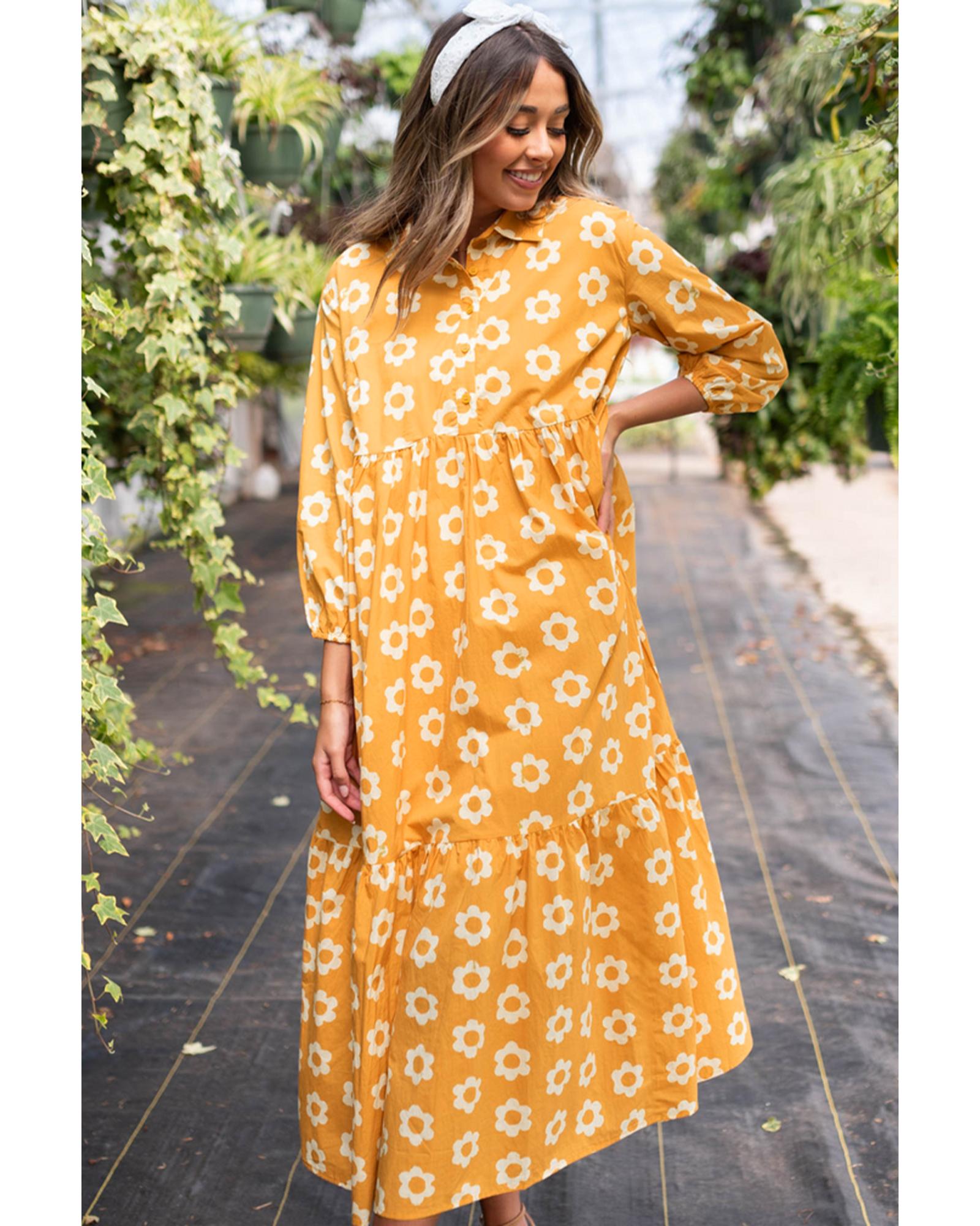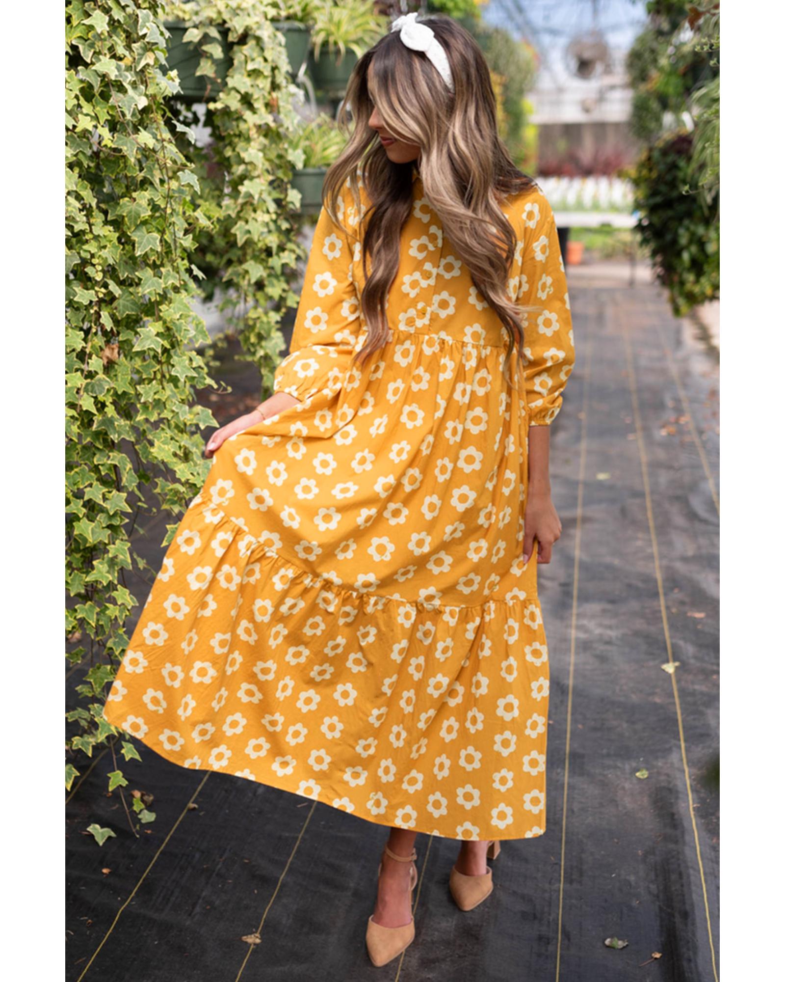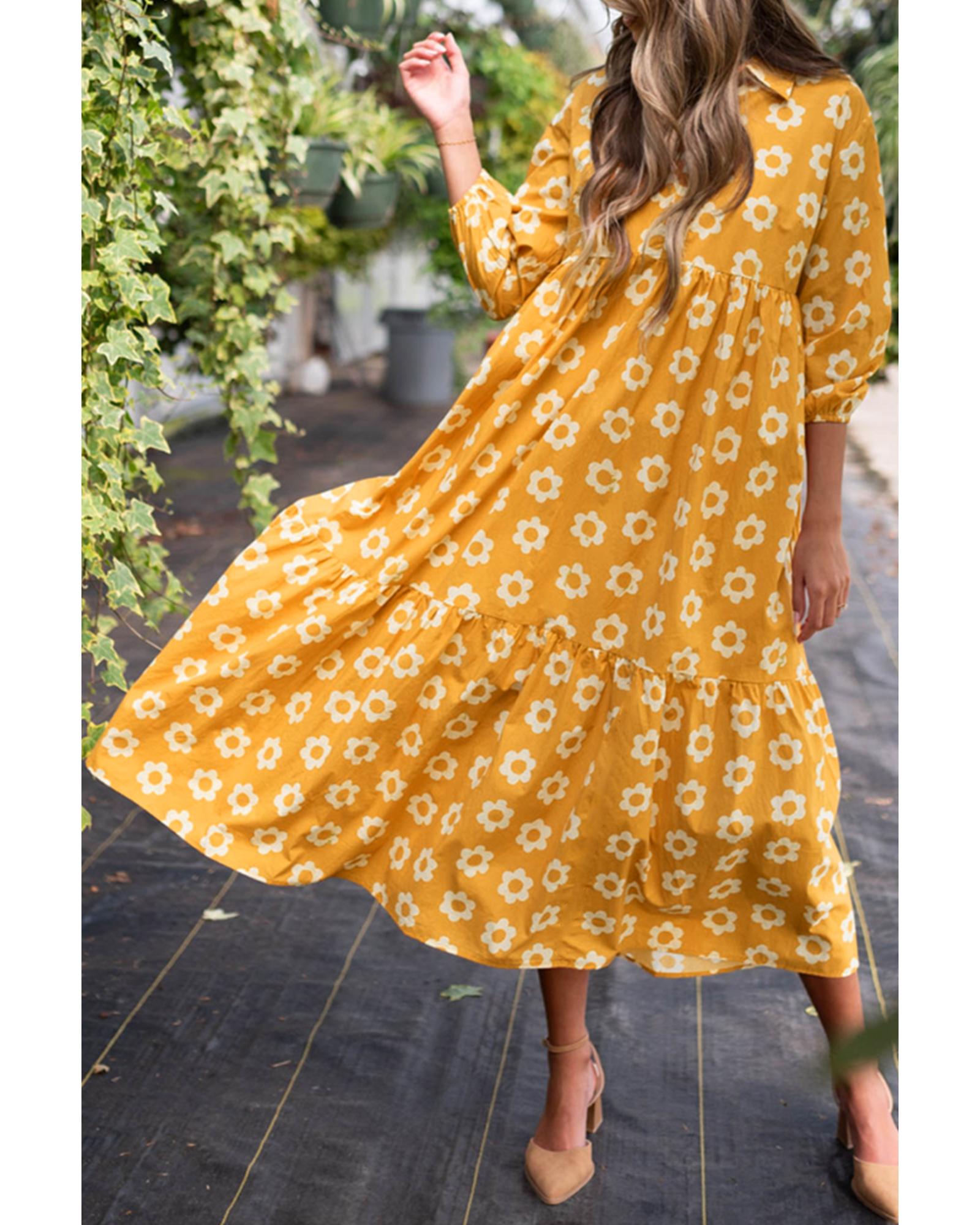 Yellow Flower Print Bracelet Sleeve Buttons Collared Maxi Dress – S