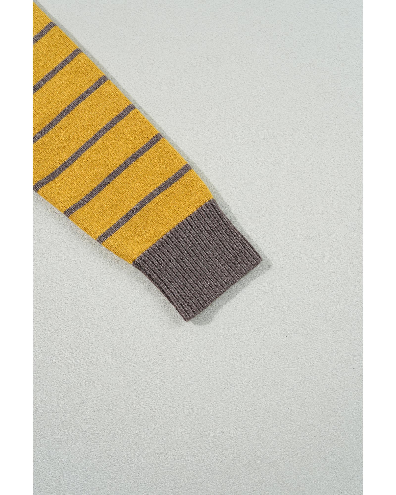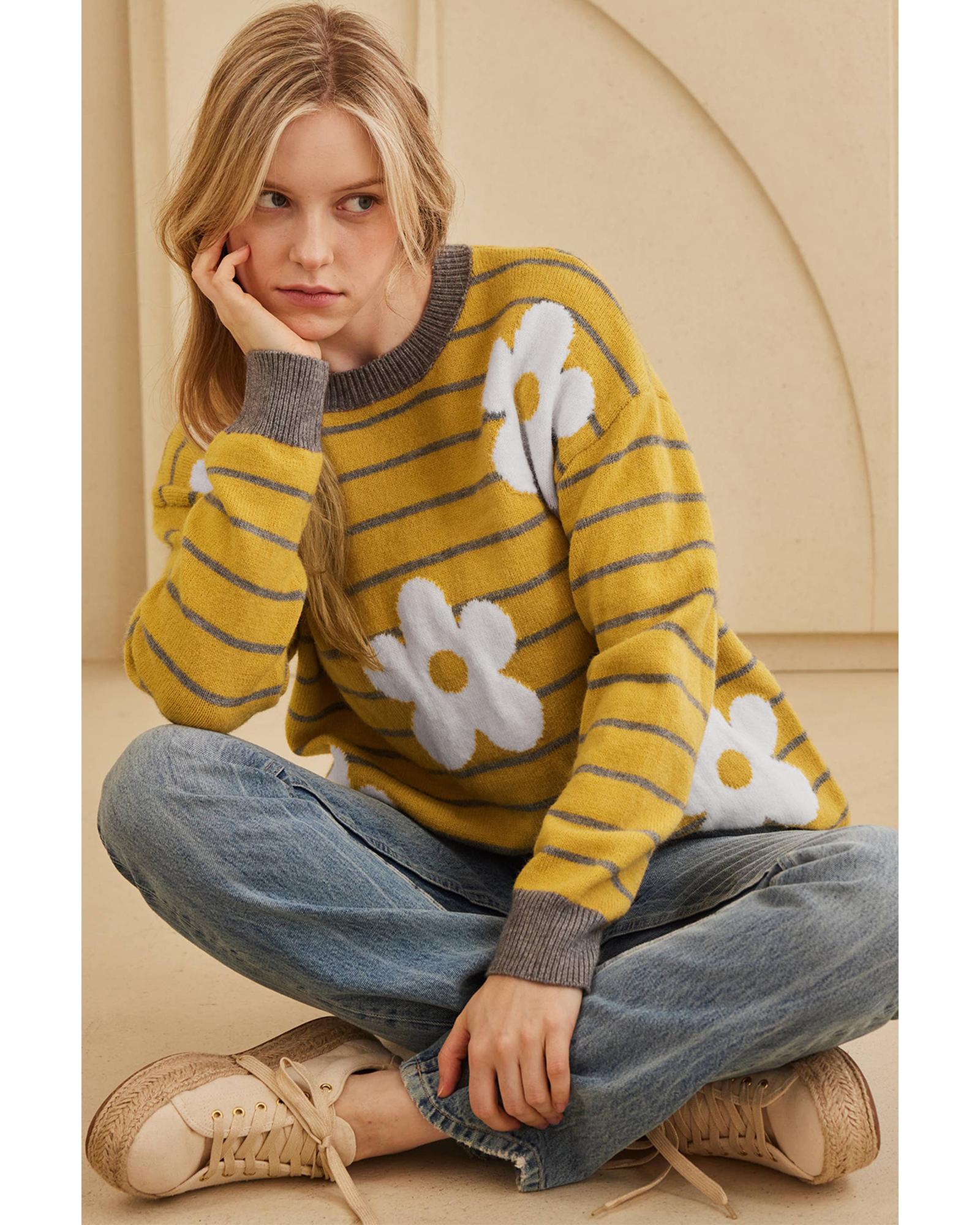 - Yellow Stripe Daisy Floral Knitted Round Neck Sweater