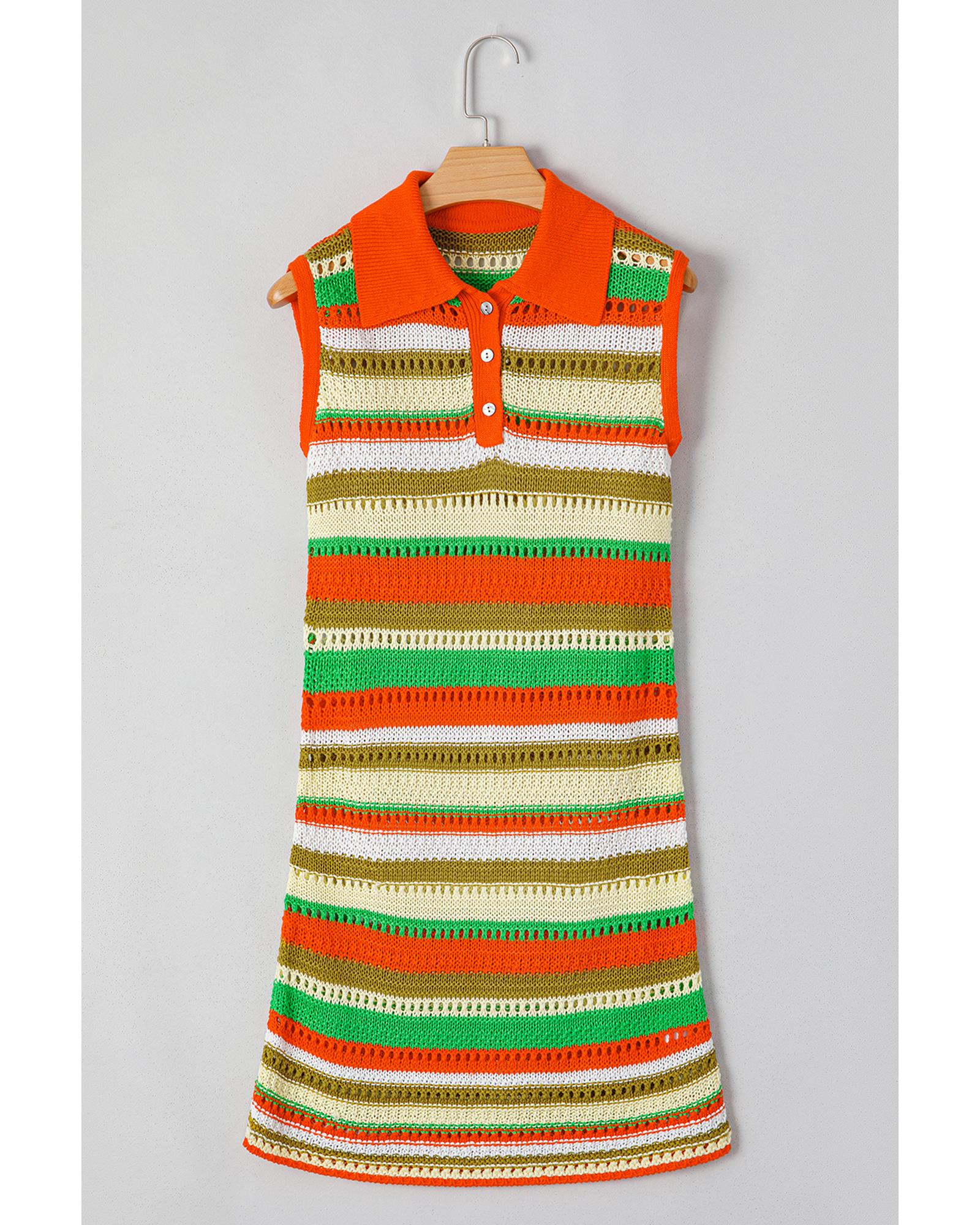 Yellow Stripe Eyelet Sleeveless Buttoned Split Neck Sweater Dress – S