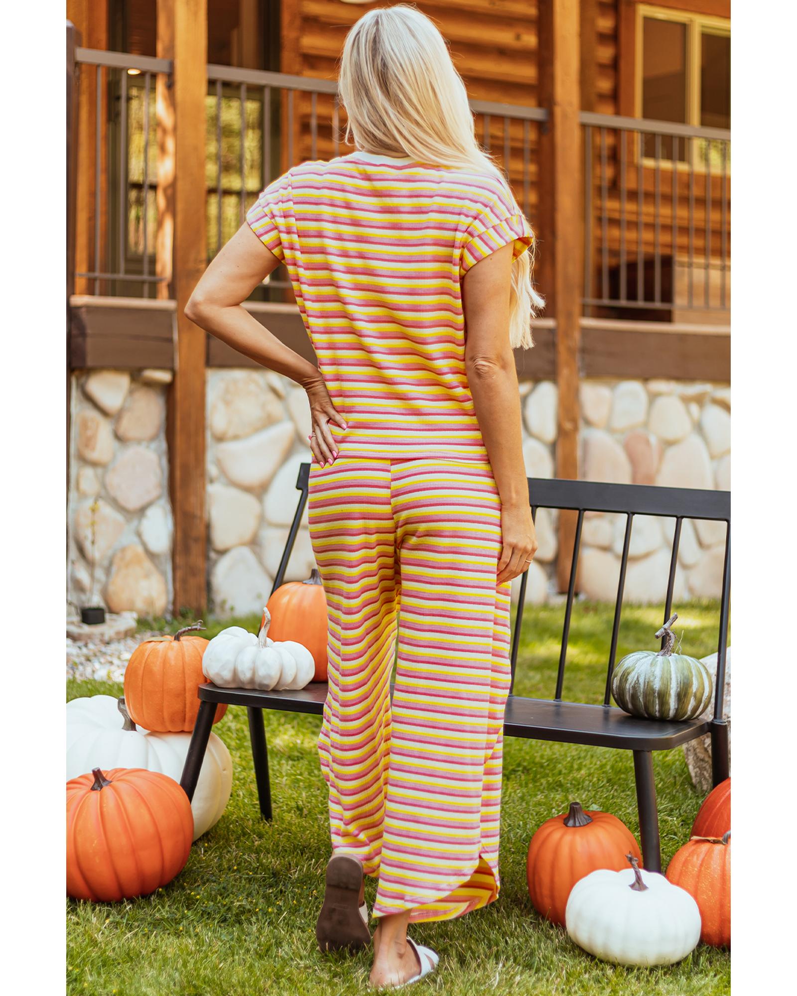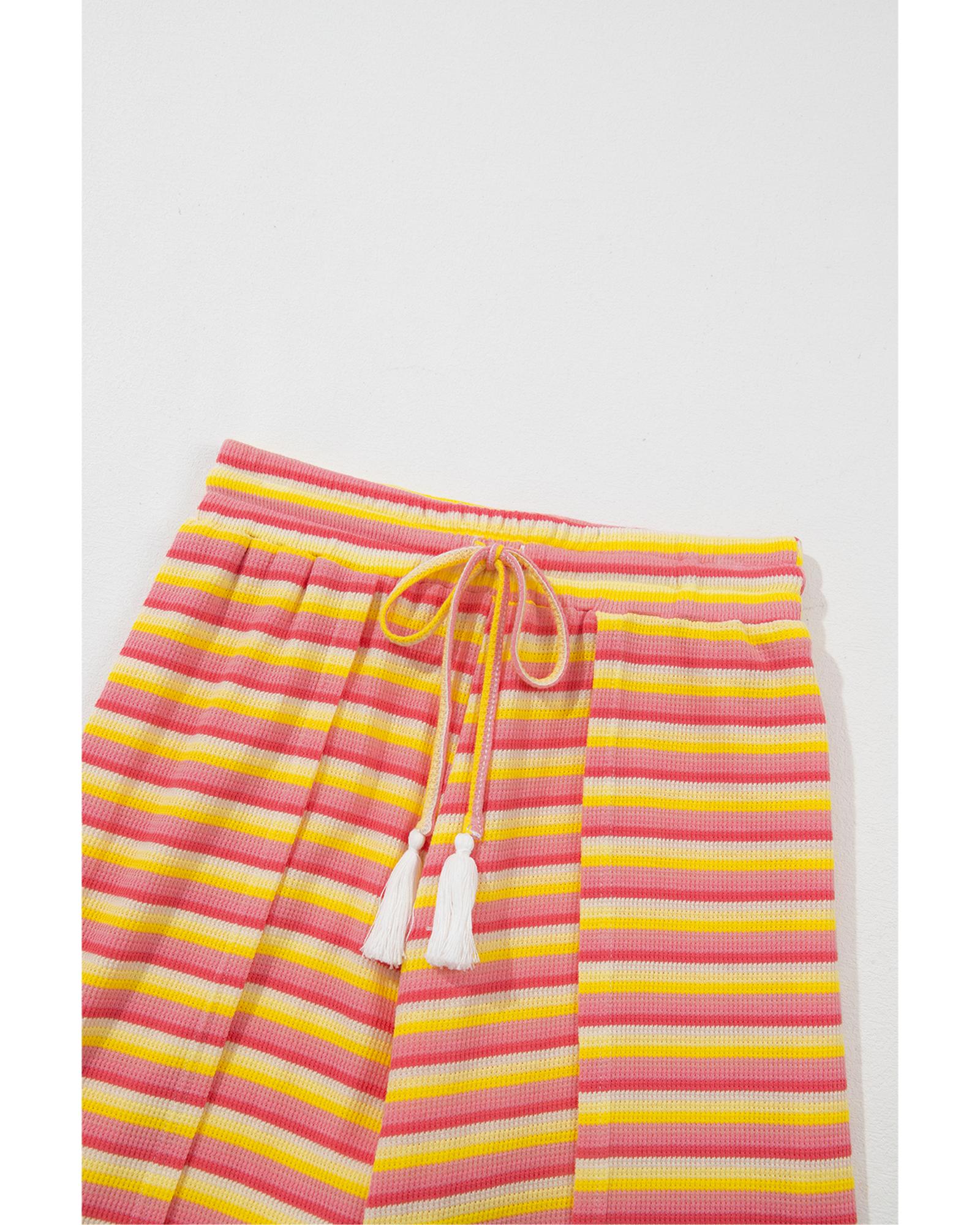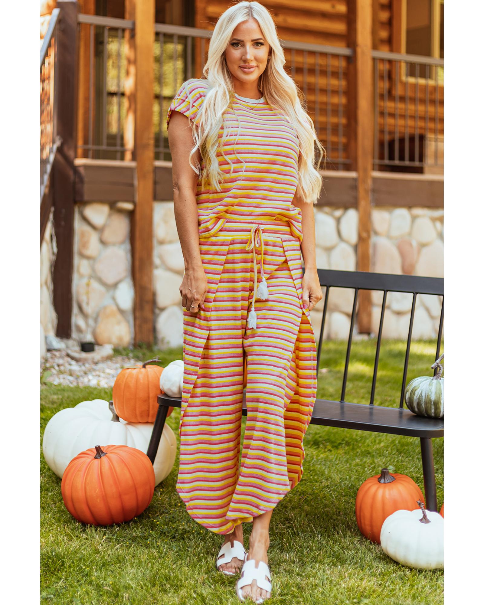 Yellow Stripe Rainbow Tee Tasseled String Wide Leg Pants Set – 2XL