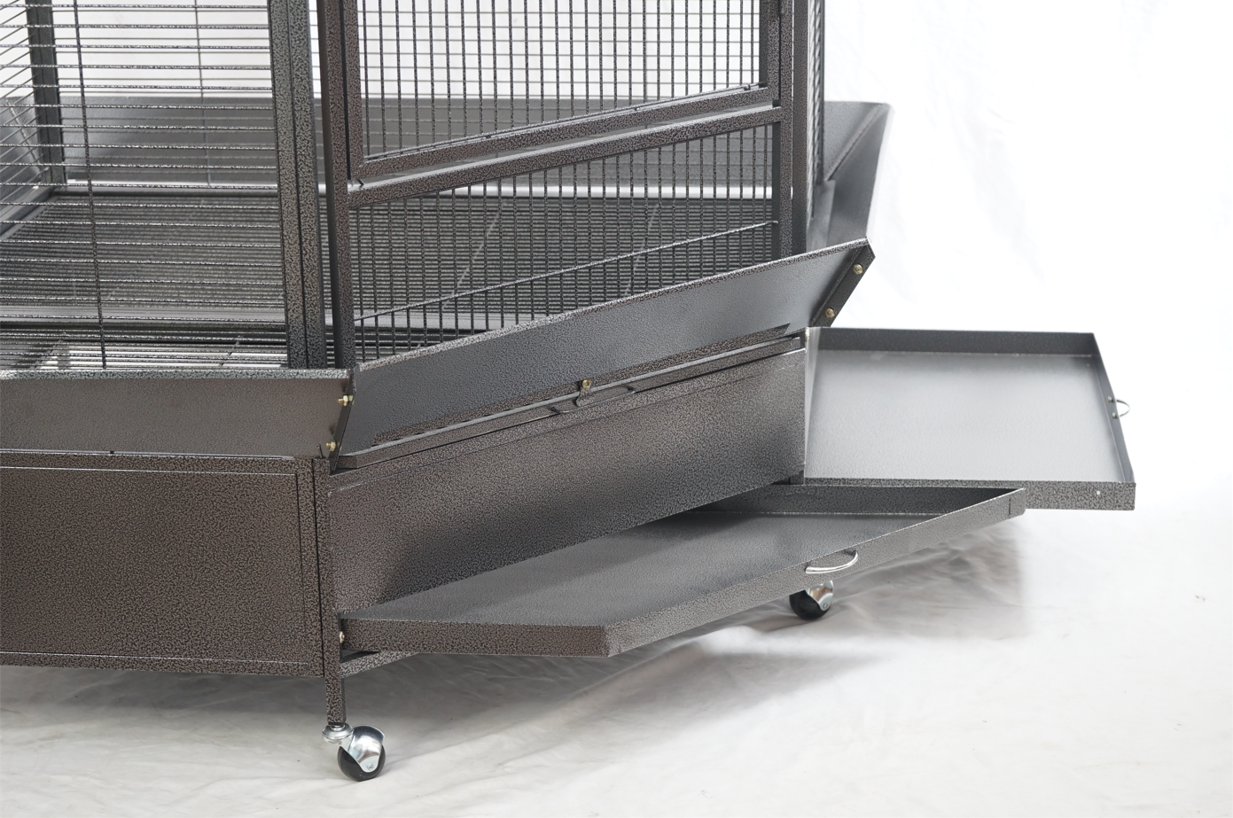 Taking care of them is made easy too with one large access door and fourside doors to reach inside fourfood and water bowls and take them out for refills or cleaning. Cleaning is hassle-free with the slide-out top and bottom tray that can also be removed. And your feather friends will feel extremely safe too with a set of secured locks to keep prying predators away.